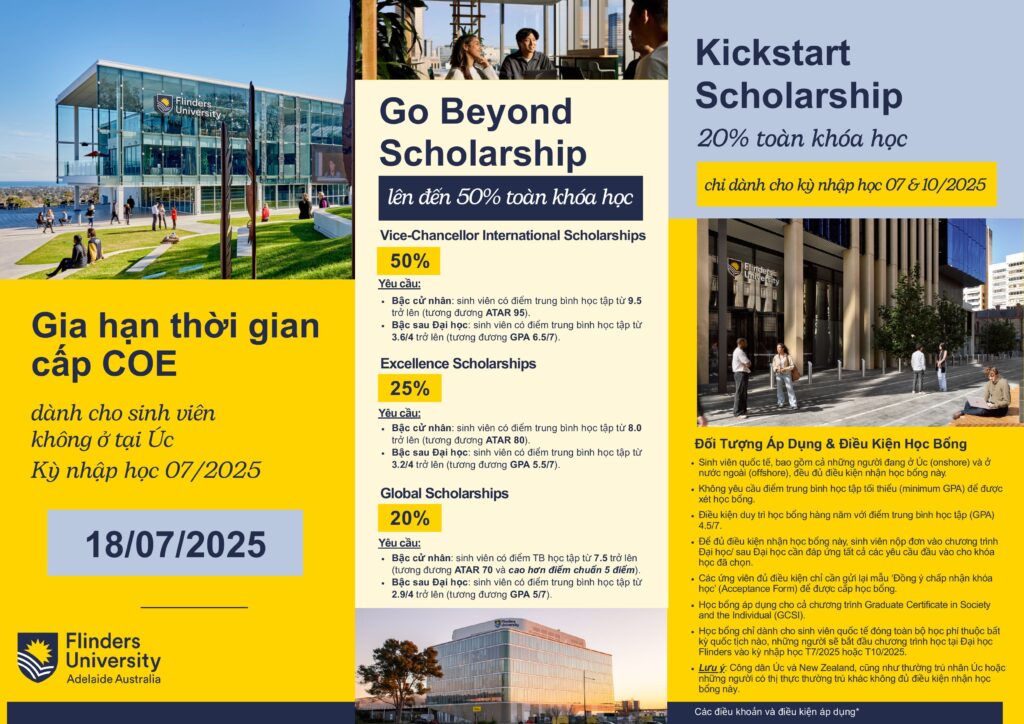 Đặc biệt, thấu hiểu nỗi lo lắng và băn khoăn của phụ huynh và học sinh Việt Nam, nhất là các bạn học sinh 2k7 vừa trải qua kì thi THPT Việt Nam, sợ rằng không đủ thời gian để hoàn thành thủ tục hồ sơ nhập học và hồ sơ visa, Đại học Flinders chính thức gia hạn thời gian nộp CoE đến hết ngày 18/7.2025 – đây là cơ hội cuối cùng để các bạn học sinh, sinh viên quốc tế hoàn thiện hồ sơ và xuất cảnh đúng hạn!